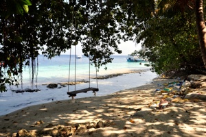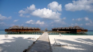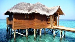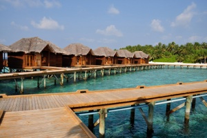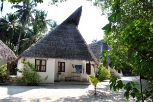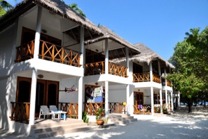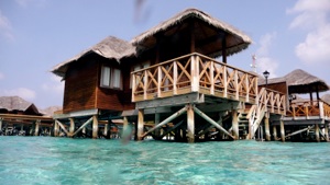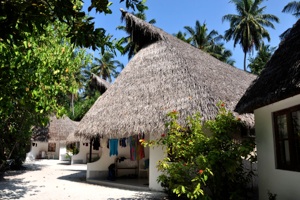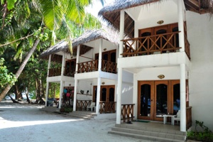 Na wyspie do wyboru są domki standardowe, tańsze i droższe - parterowe, wolno stojące lub bliźniacze, i piętrowe z pokojami na dwóch poziomach a do tego dochodzi 12 domków na wodzie (water bungalows). Postanowiliśmy zaszaleć i zaklepaliśmy sobie jeden z takch domków na wodzie. Dostaliśmy chyba jeden z najlepszych bo na końcu rzędu, z widokiem na zachód słońca i najmniej widocznym z wyspy i plaży.