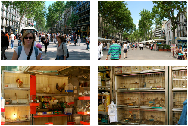 Las Ramblas is a very popular tourist spot, a very nice street, with trees lined on both sides, always crowded, and always full of street vendors selling everything from souvenirs to birds or chickens. Plus there are a lot of mime performers always doing their performances really well, and drawing attention of every passer by.