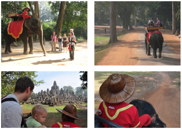 The first spot we went to see was Bayon Temple. Once we got there we noticed that we can have an elephant ride ($15 per person) around the whole Bayon temple. We decided to go for it and me, Piotr and Maya went on one elephant and Piotr’s mum and sister went on the second one. The trip was about half an hour and we saw the temple for all possible angles but it was really, really shaky and it was difficult to record any movies or even take photos without stopping for a moment. If you just ate and have a sensitive stomach you will get sick very easily. Maya was in a baby carrier and she was an additional attraction for all the tourists around us so they were taking photos of us.