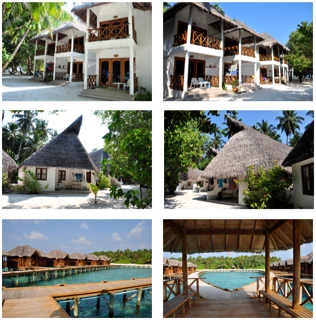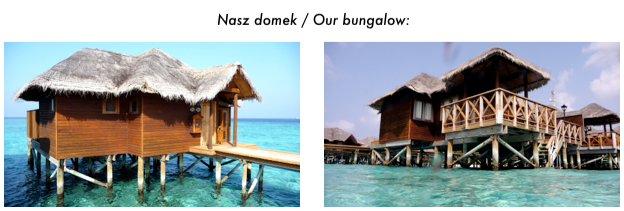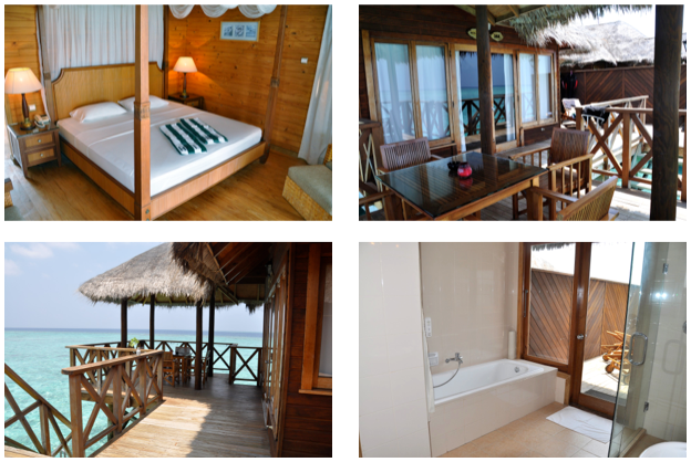 Na wyspie do wyboru są domki standardowe, tańsze i droższe - parterowe, wolno stojące lub bliźniacze, i piętrowe z pokojami na dwóch poziomach a do tego dochodzi 12 domków na wodzie (water bungalows). Postanowiliśmy zaszaleć i zaklepaliśmy sobie jeden z takch domków na wodzie. Dostaliśmy chyba jeden z najlepszych bo na końcu rzędu, z widokiem na zachód słońca i najmniej widocznym z wyspy i plaży.