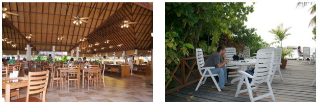 Our bungalow was pretty spacious, with a big terrace, table and chairs and sun loungers. There was a big bed, sofas and armchairs to relax during the day, separate dressing area, fridge and tea/coffee making facilities, CD radio, and a big bathroom with a separate shower. The bathroom was accessible from the dressing area as well as from the outside terrace. From the terrace we had a direct access to water - some sort of a luxury - you get up and can go for a swim or snorkelling directly from your terrace, and after you finish, you go up and straight to the bathroom for a quick shower.