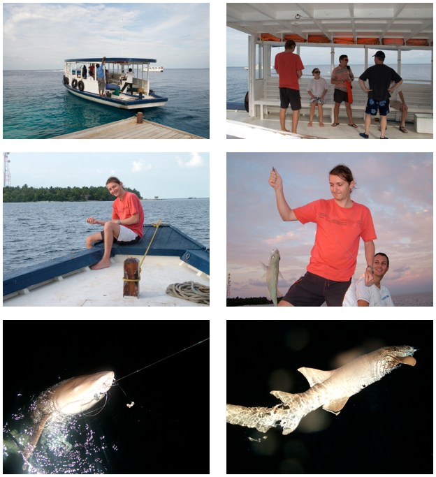 Wycieczki oferowane przez wyspę były podobne do tych, które mieliśmy na Vilamendhoo i organizuje chyba każdy lokalny resort. My skupialiśmy się jak zwykle na nurkowaniu więc wycieczki nam nie w głowie. Piotrek postanowił jednak tym razem wybrać się na łowienie ryb. Organizowane są poranne wypady, popołudniowe z zachodem słońca i nocne. Piotrek wybrał się na popołudniowe, wraz z Filipem, Magdą i dwoma innymi goścmi z naszego resortu. Wypłynęli poludniem jedną łodzią z kilkoma lokalnymi rybakami, a łowienie ryb odbywało się za pomocą zwykłej żyłki z przynętą. Jak złapało się coś większego to ciężko było trzymać żyłkę bo wżynała się w ręce ale rybacy mieli wprawę więc pomagali. Dwa razy udało im się złapać rekina (to chyba sprawka Magdy była), i chyba za każdym razem tego samego. Po złapaniu trzeba było go wypuścić z powrotem do wody ale szarpiąc się zaplątywał się w żyłkę więc nie było łatwo.