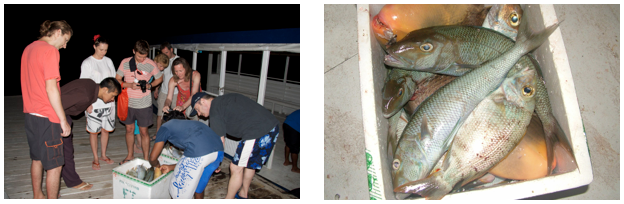 Z połowu wrócili już po zachodzie słońca z kilkoma skrzynkami dosyć sporych ryb, które po kolacji dopiero około 22:00 są smażone na grillu i można przyjść i się najeść. Piotrkowi specjalnie na próbowaniu ich nie zależało i już byliśmy po kolacji więc spasowaliśmy.