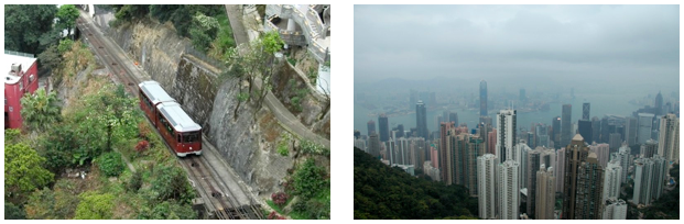 Najpopularniejszą atrakcją HK jest The Peak Tower - wieża widokowa na wzgórzu. Na wzgórze wjeżdża się po torach tramwajem/kolejką wciąganym przez odpowiedni linowy mechanizm. Jest to jedna z najstarszych i najsławniejsza kolejka, wjeżdża na wysokość 396 m n.p.m. Na samej górze znajduje się kilkupiętrowy budynek-wieża, z restauracjami, sklepami i muzeum woskowym a na szczycie otwarty taras widokowy skąd można oglądać panoramę całego miasta. Taras znajduje się na wysokości 428 metrów. Piotrek trochę ma lęk wysokości więc trzymał się raczej środka a robienie zdjęć przypadło mnie. Wjechaliśmy tam późnym popołudniem więc oglądaliśmy najpierw panoramę za dnia.