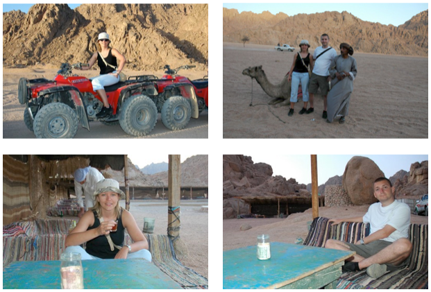 On a last day before going back we never dive so we decided to have a quad trip and ride a camel. Driving a quad is not so easy but takes little time to get used to. There were about 30 of those and we were directed by some locals how and where to drive, in a queue. We got to the desert, rode camels, visited a Beduin village, had some Beduin tea and we went back to Naama Bay in a queue again. The trip was in the late afternoon so we we’re coming back after dark.