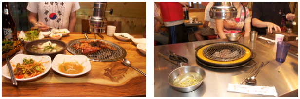Typowo Koreańska restauracja to niski stół i siedzenie na ziemi. Tak też koreańczycy jadają w swoich domach. Używają też metalowych pałeczek. Są też miejsca gdzie są normalnej wysokości stoły z krzesłami, jak ktoś nie lubi siedzieć na ziemi.