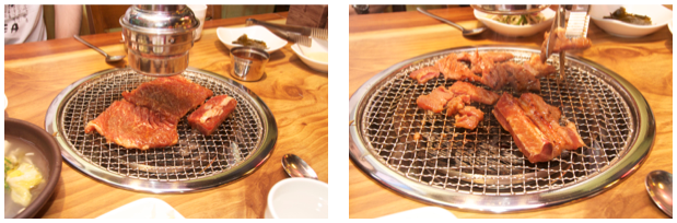 Mięso często grillują kelnerki, ale czasem dają surowe mięso i samemu można grillować. Jak jadamy wieprzowinę czy wołowinę to jeden czy dwa kawały mięsa wrzucane są na grilla, jak się zgrillują to nożyczkami rozcinane są na małe kawałeczki i potem można jeść jak kto woli - napopularniejsza opcja to zawijanie tych kawałeczków gotowego mięsa w liść sałaty, dodanie czosnku czy szczypiora czy jakiegoś sosu, zawinięcie wszystkiego razem ciasno i na raz do buzi. Bardzo smaczne.