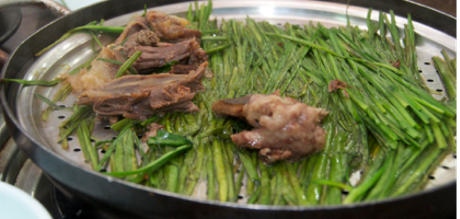 We had this dinner in a traditional Korean style, sitting on the floor, with Korean side dishes and using Korean metal chopsticks. The meat was already cooked; the waitress only threw it on the steam plate so that it was warm for us to eat. I had few small pieces but didn’t like it very much. It is a bit gummy and doesn’t taste especially good, so I decied to eat some rice and kimchi instead. Possibly it was already in my head that I knew the meat was a dog, and I didn’t want to eat it.
