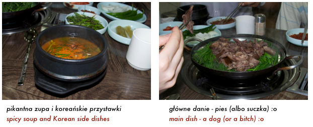 Tradycyjnie siedzieliśmy po koreańsku na ziemi przy niskim stole, z koreańskimi przystawkami i jedząc koreańskimi metalowymi pałeczkami. Mięso było juz gotowe tylko kelnerka wrzuciła je na palnik (nad parę) żeby było ciepłe. Ja zjadłam kilka małych kawałeczków ale mi nie smakowało. Jest trochę gumowe i nic specjalnego w smaku, więc spasowałam i zostałam przy kimchi i ryżu. Może psychicznie dlatego że wiedziałam że to pies, nie chciałam za bardzo jeść i nie za bardzo mi podchodziło.