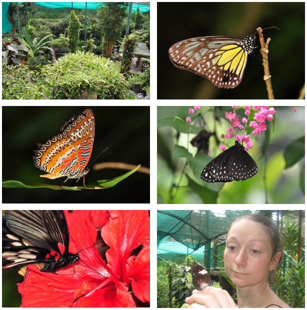 Butterfly Park czyli Motylarnia to niewielki obszar ale bardzo gęsto zarośnięty i bardzo ładnie zaprojektowany - tu stawik, tam wodospadzik, tu ławeczki, tam pergola, itp, itd. Od góry wszystko przykryte siatką aby motyle wiedziały gdzie ich dom, podobnie jak w ptaszarni, wchodzi się jakby do gigantycznej klatki z motylami. Znajduje się tu ponad 6000 motyli (ponad 120 gatunków) i naprawdę było ich mnóstwo, w różnych kolorach i kształtach. Oprócz sporej ilości kwiatów, znajudją się tu też jadłodajnie dla motyli a te z nich rzeczywiście korzystają. Pamiętaliśmy aby zabrać obiektyw makro więc Piotrkowi udało się zrobić sporo motyli z bliska. Szwagierce udało się zwabić motyla i nawet usiadł jej na ręce. Wstęp do parku kosztuje 18 Rinngit (około 18 PLN) plus 1 Ringgit opłaty za aparat fotograficzny.