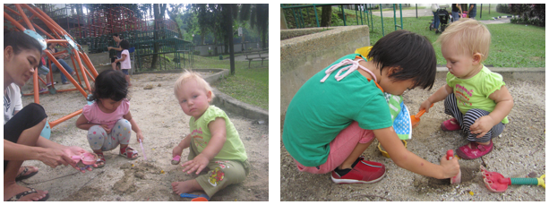 Imion dzieci znam zaledwie kilka, tych których widujemy często. Naczęściej widujemy Hinako (miesiąc starsza) z mamą i Yumu (dwa miesiące starszy) z mamą. Mama Yumu mówi po angielsku na tyle, że można w miarę prowadzić konwesrajce. Mama Hinako nie mówi za wiele, ale rozumie sporo, ale konwersacji nie da się za bardzo prowadzić. Jest jeszcze jeden kolega (2 miesiące starszy), którego imienia nie pamiętam (a może nawet nigdy nie pytałam) ale widujemy ich często. Z tą trójcą spotykamy się naczęściej na placu zabaw, głównie w piaskownicy, ale i czasami też na basenie.