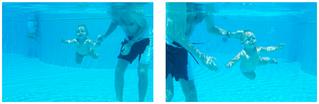 Jak chodzimy wszyscy w trójkę na basen to Piotrek głównie pływa z Mayą, topiąc ją przy tym od czasu do czasu. Z tego co widzimy to po zanurzeniu dosłownie na moment, odruchowo nabiera powietrza i trzyma pod wodą, bo nie widzimy żeby jakieś bąbelki wypuszczała. I co ważne, nie płacze po wynurzeniu, trochę pokaszle i dalej szaleje ;)