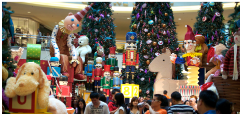 W centrach handlowych panuje szał zakupów, są tłumy, tłumy ludzi, robią sobie zdjęcia przy misiach w czerwonych czapach czy ponadwymiarowych choinkach. Nie tylko dzieci, starsi i młodsi, i wydaje się jakby specjalnie do centrum handlowego przyszli po to żeby porobić sobie zdjęcia, jakby to były ich pierwsze święta.